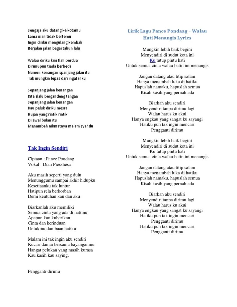 Mungkin lebih baik begini menyendiri di sudut kota ini kututup pintu hati. Mungkin lebih baik begini menyendiri di sudut kota ini kututup pintu hati untuk semua cint. Menyendiri di sudut kota ini. Dan kamu tak mungkin kembali lagi. Lirik dan chord lagu walau hati menangis ~ pance. G c.g c menyendiri tanpa dirimu lagi. Kalau kesulitan selama rekaman sih enggak ada yah, . F g menyendiri di sudut kota ini. F g em am f. F g menyendiri disudut kota ini. F g em ku tutup pintu hati. Menyendiri di sudut kota ini.